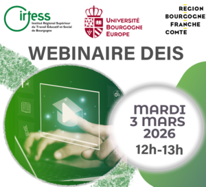 Vous souhaitez vous engager dans la passionnante aventure de l’ingénierie sociale et booster votre carrière ? RV mardi 3 mars de 12h à 13h. S’inscrire : skellenberger@irtess.fr Participez au webinaire sur la formation au Diplôme d’Etat d’Ingéniérie social (DEIS) proposé par l’IRTESS, adossé au Master « Chargé d’études sociologiques » de l’Université de Bourgogne Europe…