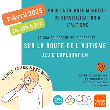 Le Centre Ressources Autisme Bourgogne – CHU Dijon, en partenariat avec La Toison d’Or, organise une animation interactive et ludique pour sensibiliser le grand public à l’autisme. Gratuit et ouvert à tous. Venez participer à un parcours interactif "Sur la route de l’autisme" composé de 4 ateliers thématiques. Ce jeu d'exploration vise à mieux comprendre…